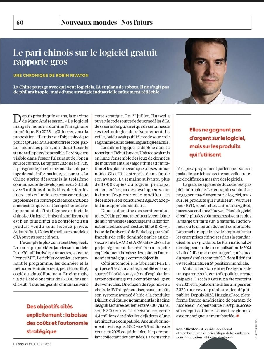 In automotive, manufacturer Pen Li, which holds roughly 5% of the market, has open-sourced Halo OS, its car operating system, including intelligent vehicle control. It’s a way to answer BYD’s decision to roll out its advanced driver-assistance system DiPilot across all 21 model lines at no extra cost—including the Seagull, priced at ¥69,800 (€8,276). The stack runs on DiPilot 600 (three lidars), DiPilot 300 (one lidar), and DiPilot 100 (camera only). The move covers 4.4 million vehicles already fitted with a compatible architecture. No subscription required. BYD is targeting 5.5 million sales in 2025, which would double the rolling fleet that feeds back data. This isn’t open source, but it springs from the same strategic logic.